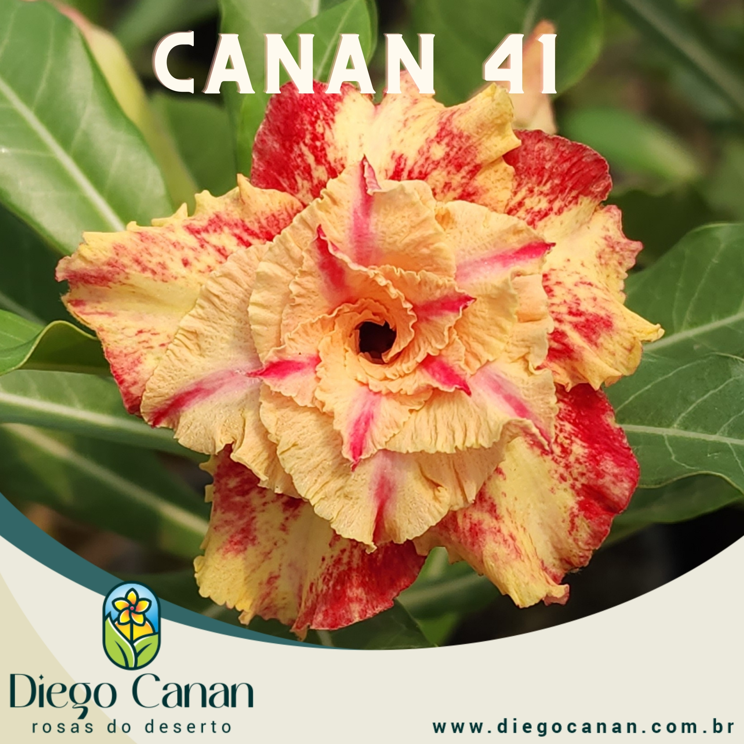 Enxerto da cor CANAN 41, uma flor tripla, cor vermelha na primeira camada com mesclas amarelas, segunda e terceira seguindo um tom amarelo meclada em tom rosa, lembra muito uma chama de fogo, ótima para fazer enxertos. excelentes resultados em polinizações.