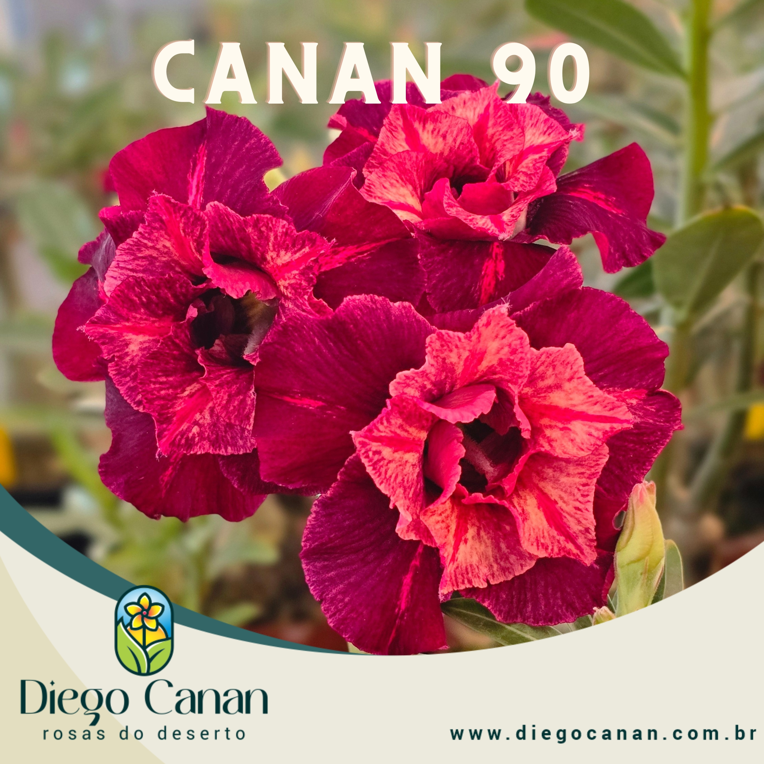 Enxerto da cor CANAN 90. Uma flor dupla, de cor meio vinho com o miolo amarelado na camada central amarelada podendo variar a intensidade, ótima para fazer enxertos e polinizações, passando facilmente seus genes a frente.